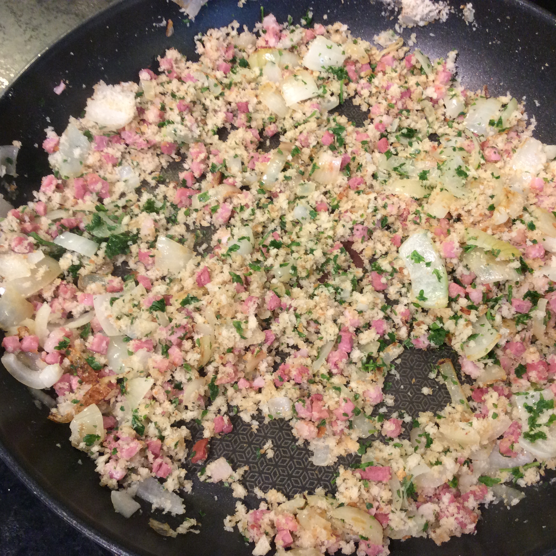 1. Put one tablespoon of oil in a frying pan and warm on a medium heat. Chop the onions and fry gently for about 5 minutes. Then add chopped pancetta or katenschinken and fry for 2 to 3 minutes. Then add the breadcrumbs and chopped parsley and fry for a further 2 to 3 minutes.
