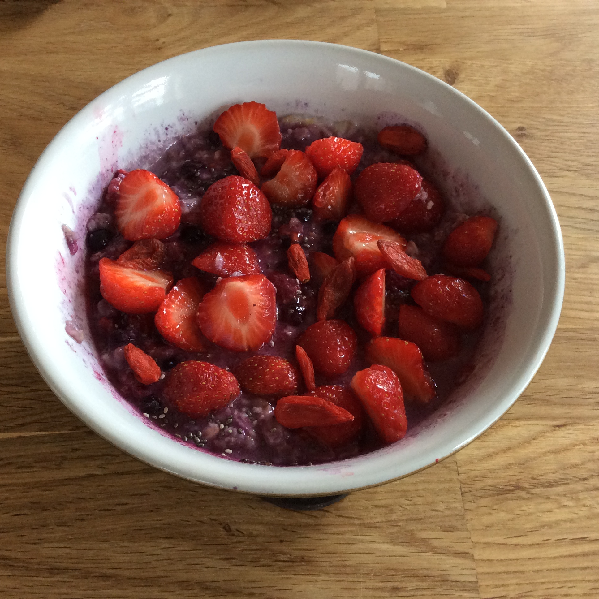 This is a healthy summer Very Berry porridge. To keep the cost down and for convenience I have used frozen blueberries and raspberries. The cooked porridge is topped with strawberries and goji berries. I add some chia seeds to make it even healthier for you.